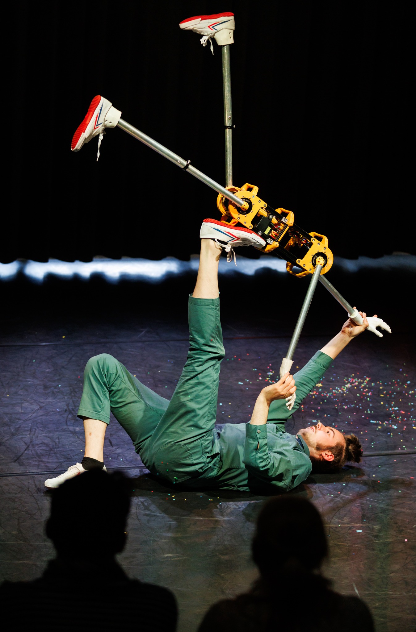 The Acrobot is a groundbreaking performance introducing a self-built robotic acrobat. Through an exciting mix of juggling, acrobatics, and storytelling it pokes at the questions of our post-digital society.
